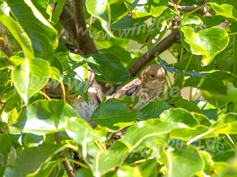 Ein Vogelnest in einer Baumkrone. Das Nest ist gut in den Blättern versteckt. Es sind mehrere Küken zu sehen. Die Jungtiere machen den Eindruck von halbwüchsigen Jungvögeln. Sie können noch nicht fliegen, sind aber schon fast so groß wie ihre Eltern. Das Federkleid ist noch grau. Bunte Federn wie an die Elterntieren sind bei den jungen Stieglitzen noch nicht zu sehen. Das wird von Grün- , Braun- und Grautönen bestimmt. Das Wetter war schön. Es war ein sonniger Tag.