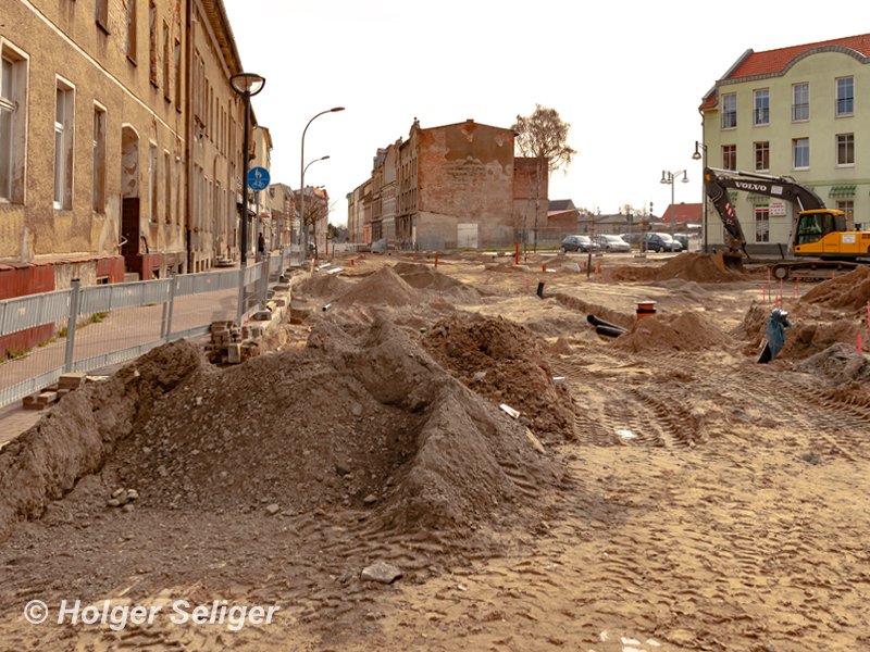 Blick über den Anklamer Marktplatz auf seine Westseite. An der Straßenecke "Keilstraße – Burgstraße" sind die ersten Platten des ehemaligen des Wohn- und Geschäftshauses gefallen. Der Abrissbagger hat die ersten Balkone samt Wände eingerissen.