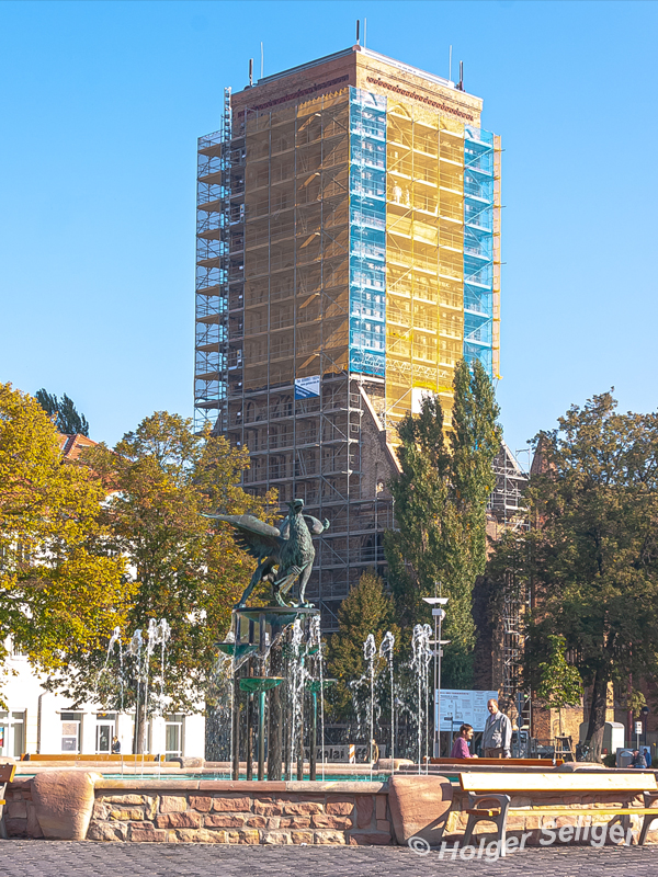 Blick über den Anklamer Marktplatz auf seine Westseite. An der Straßenecke "Keilstraße – Burgstraße" sind die ersten Platten des ehemaligen des Wohn- und Geschäftshauses gefallen. Der Abrissbagger hat die ersten Balkone samt Wände eingerissen.
