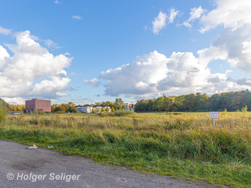 Blick über den Anklamer Marktplatz auf seine Westseite. An der Straßenecke "Keilstraße – Burgstraße" sind die ersten Platten des ehemaligen des Wohn- und Geschäftshauses gefallen. Der Abrissbagger hat die ersten Balkone samt Wände eingerissen.